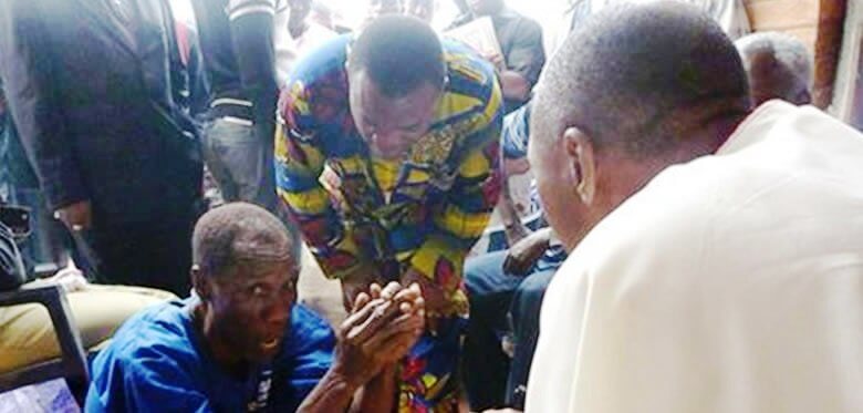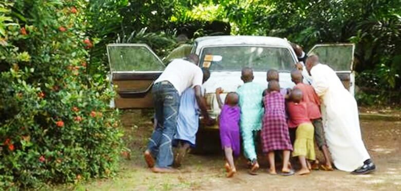 This car must move! Msgr. Obiora Francis Ike trying to move a